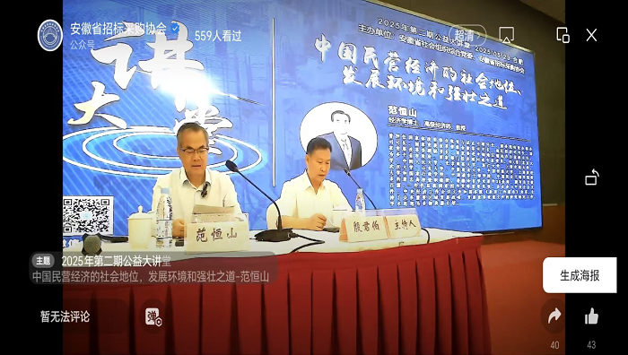 为深入学习贯彻习近平总书记关于民营经济发展的重要论述,全面贯彻《中华人民共和国民营经济促进法》,进一步提升我省各类市场主体对相关法规政策的理解与执行能力,推动我省民营经济高质量发展,安徽省发展改革委、安徽省招标采购协会2025年05月23日组织开展了“公益大讲堂”活动,安徽华明工程造价有限公司带头积极参加,本次公益大讲堂内容深刻且富有意义,现将现场学习交流情况报道如下:
