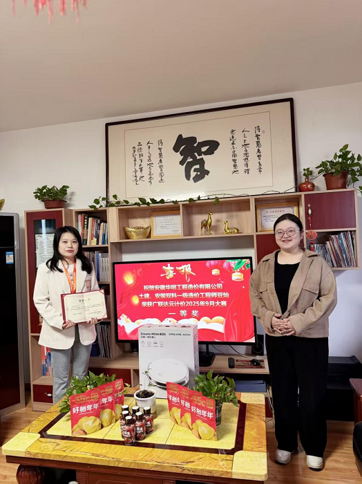 2025年10月16日上午广联达工作人员到我司为此次荣获一等奖豆灿颁发荣誉及奖品。