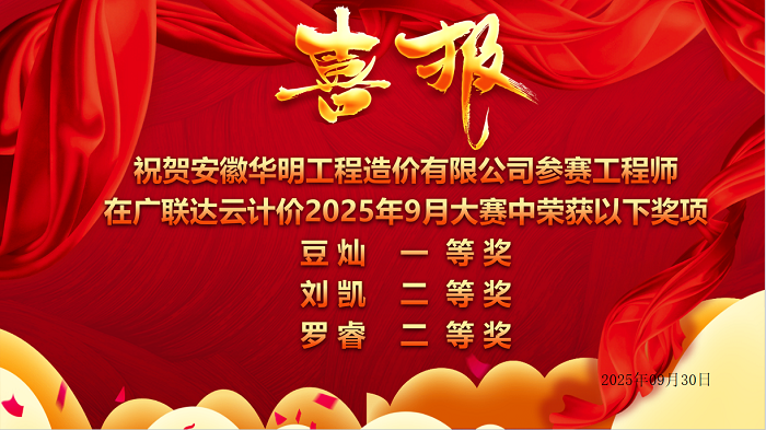 在刚刚结束的2025年09月份广联达云计价大赛中,安徽华明工程造价有限公司造价团队再创佳绩,经过与安徽省造价高手的激烈角逐,我司豆灿勇夺一等奖,刘凯、罗睿荣获二等奖!本次大赛由行业领先的数字建筑平台服务商广联达科技股份有限公司安徽分公司主办。此次双奖加冕,不仅是对获奖工程师个人专业能力的顶级认可,更是安徽华明工程造价有限公司在建筑工程数字化造价、精细化成本管控领域 深厚实力与领先水平的集中展现!