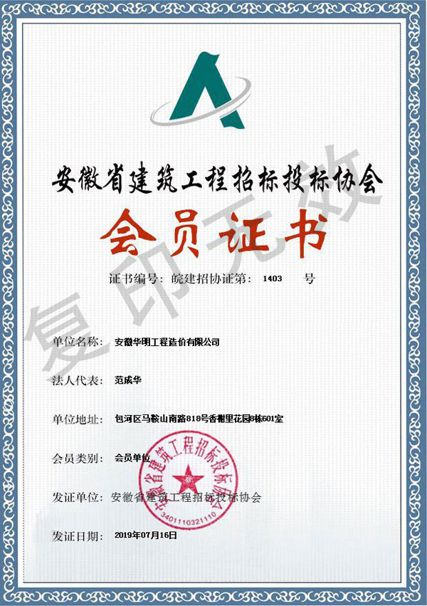 安徽省建筑工程招标投标协会---会员证书